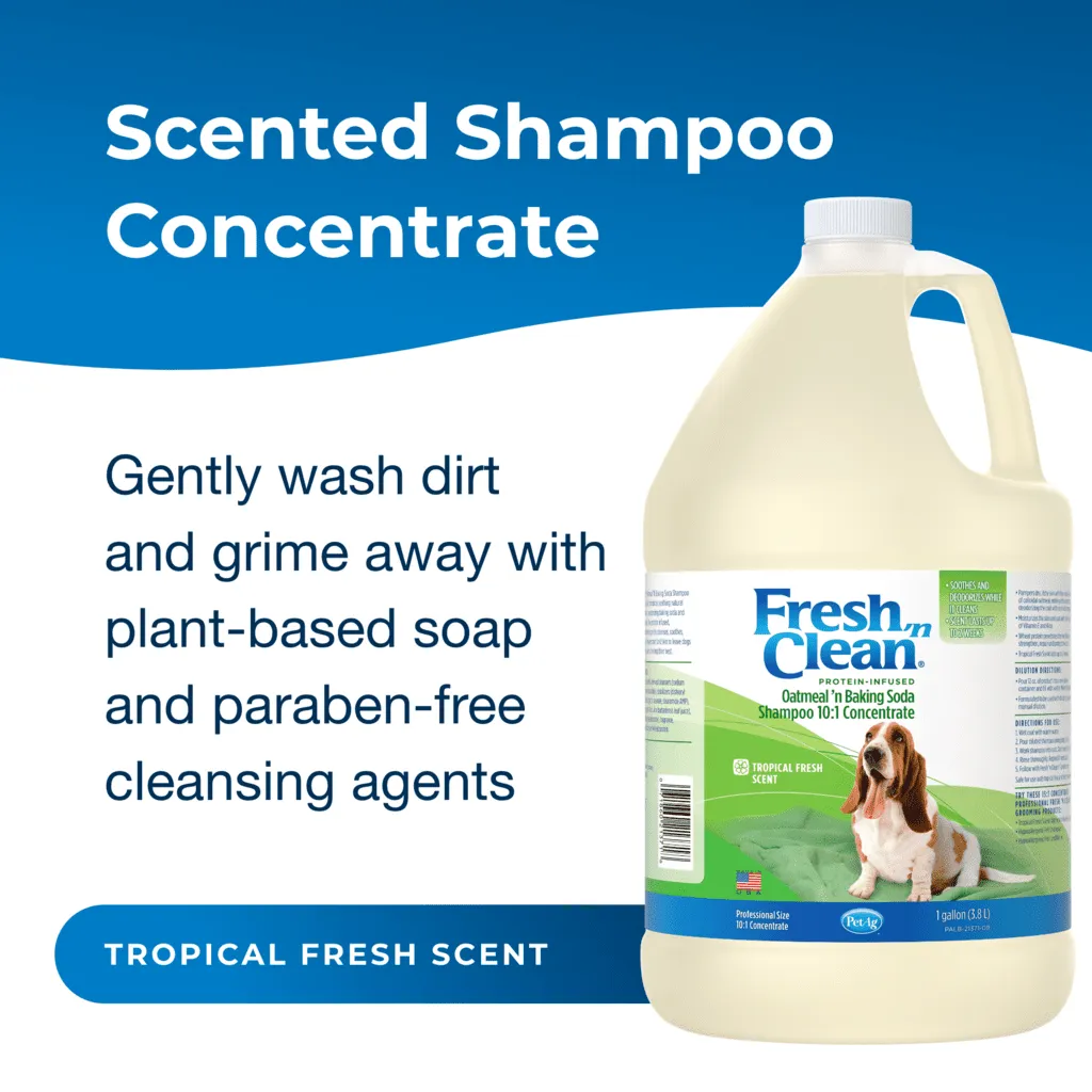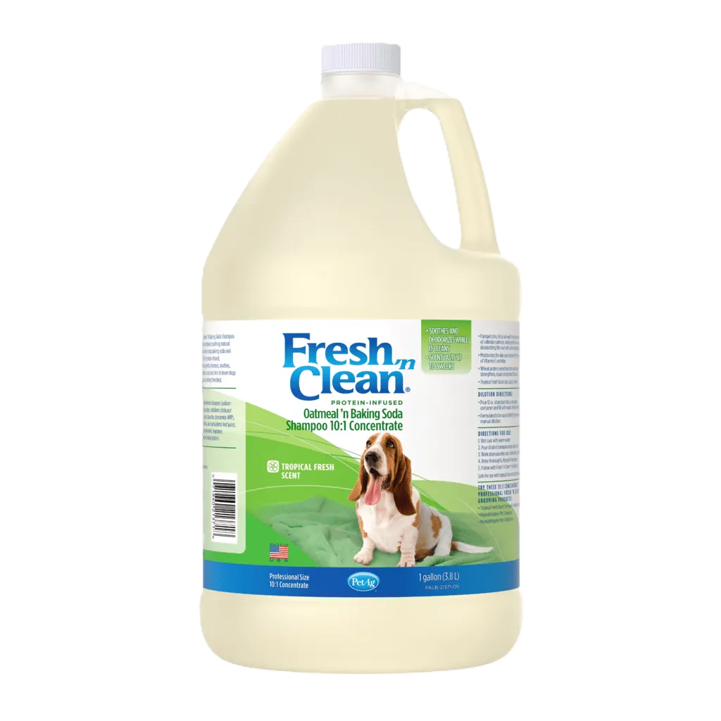 The preferred choice of groomers, Fresh ‘n Clean Oatmeal ‘n Baking Soda Shampoo is ideal for dogs with dry, itchy and sensitive skin. The natural soap-free formula is 95% plant-derived and combines the soothing qualities of colloidal oatmeal with the odor-controlling power of baking soda. Infused with protein, vitamin E and aloe, this shampoo repairs and moisturizes for a healthy, manageable coat. The 10:1 concentration saves on shipping costs with more washes per bottle. And the Fresh ‘n Clean signature, long-lasting fragrance keeps your client’s dog smelling fresh up to two weeks.