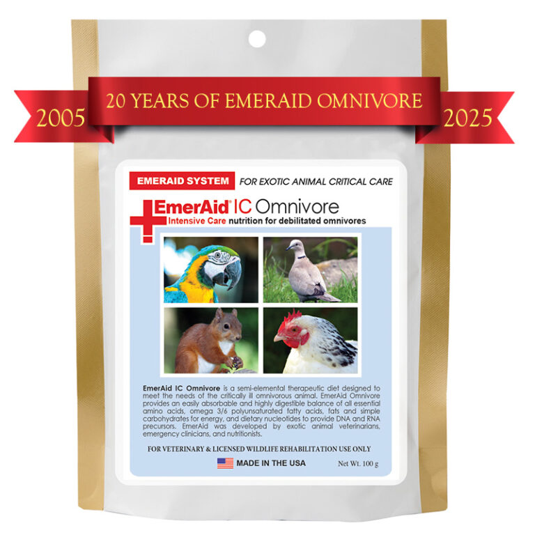 EmerAid Intensive Care Omnivore is a part of the EmerAid System for Exotic Animal Critical Care, which is divided into three categories: Carnivore, Herbivore, and Omnivore. By using these products singly or in combination, many different ill exotic animals can benefit nutritionally.